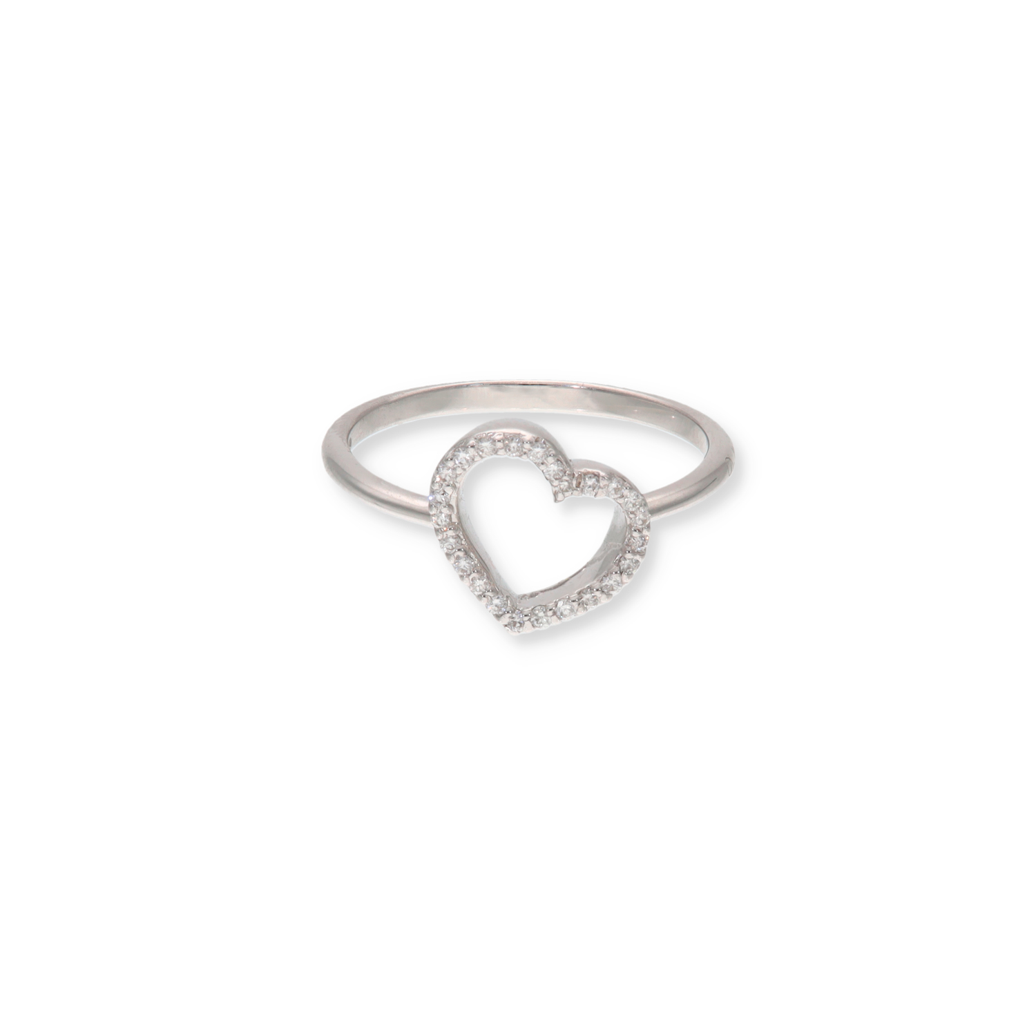 Questo anello a forma di cuore è disponibile in oro bianco, oro giallo o oro rosa 18 carati, impreziosito da un contorno pavé di diamanti (0,11 ct, colore F).