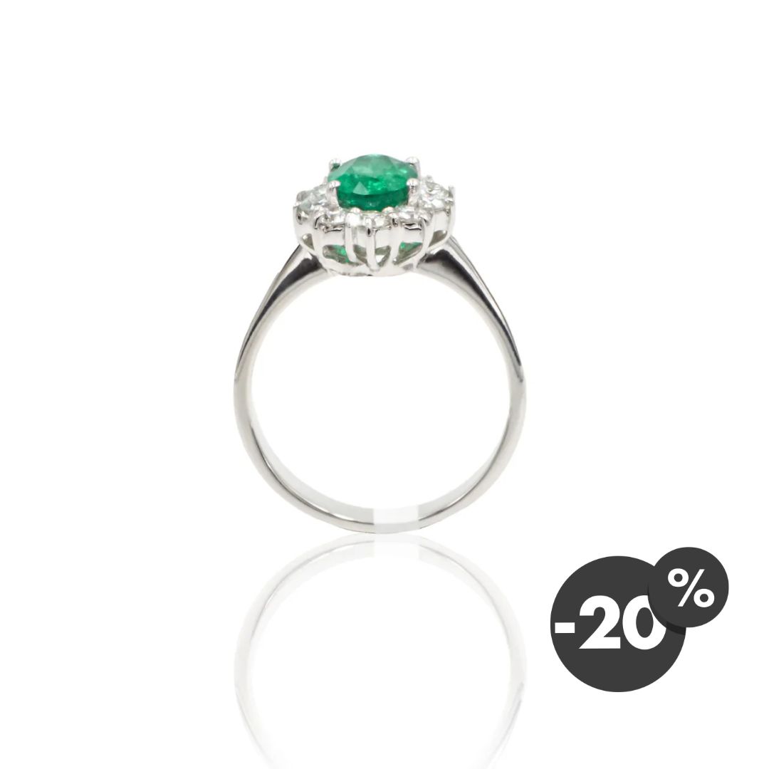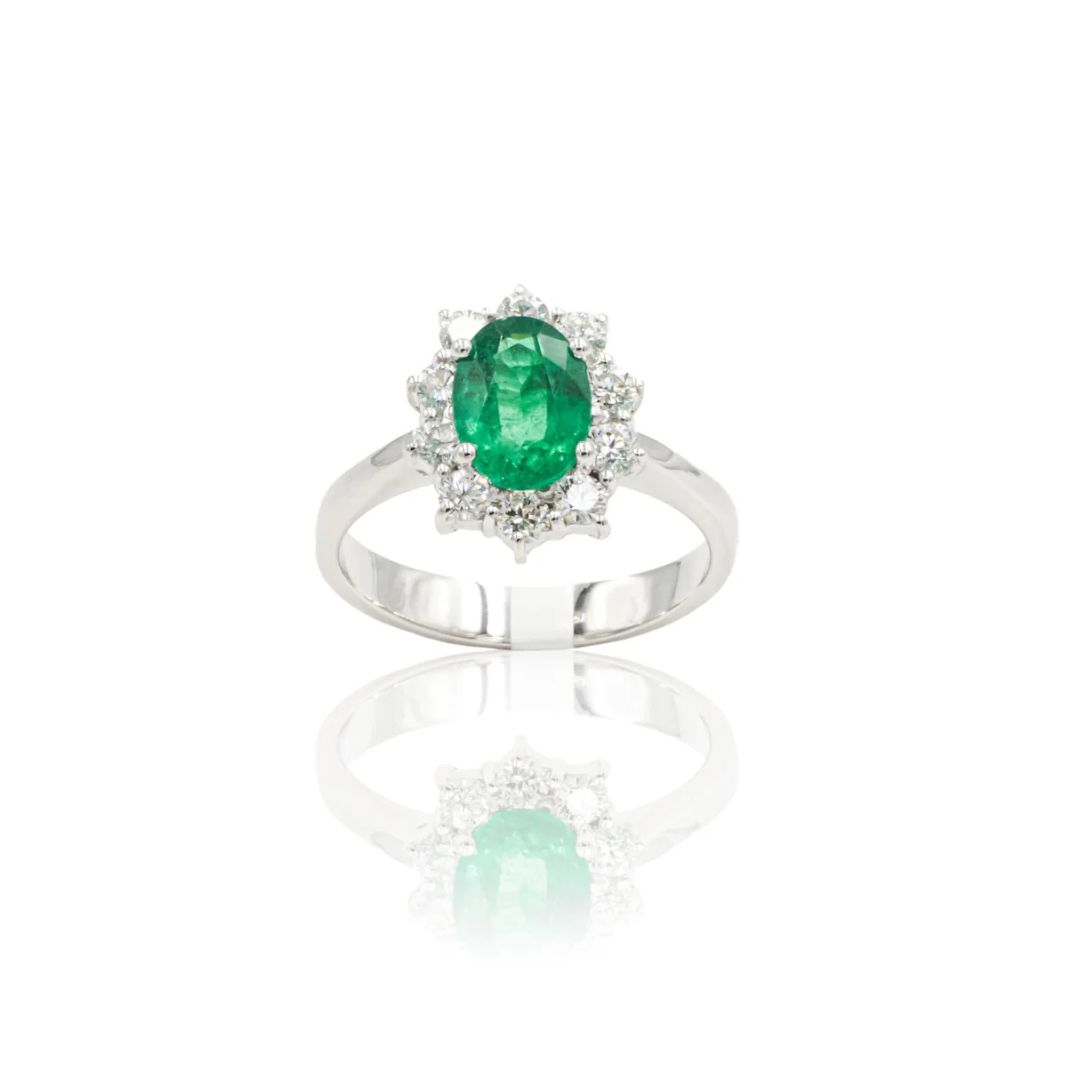 Elegante e raffinato anello realizzato in oro bianco 18 carati, impreziosito da uno smeraldo naturale taglio ovale da 0,38 carati, dal colore intenso e luminoso.