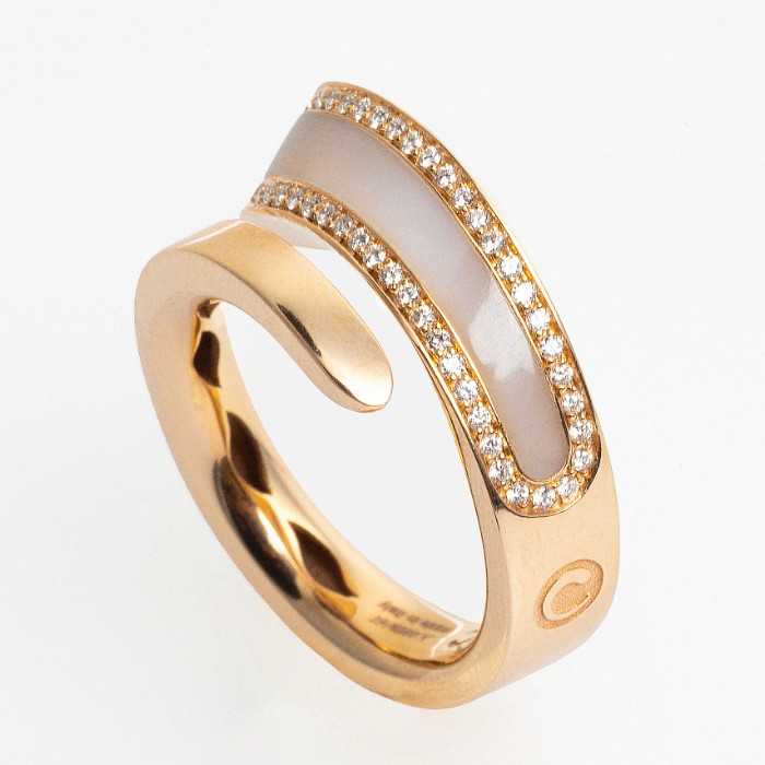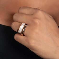 Anello oro rosa con diamanti e madreperla dal design essenziale ed avvolgente.