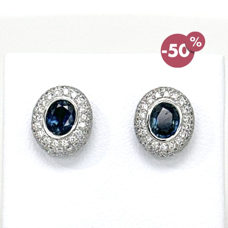 Raffinati orecchini in oro bianco 18 kt, impreziositi da due splendidi zaffiri ovali naturali del peso complessivo di 1,00 ct, circondati da una luminosa cornice di diamanti taglio brillante per un totale di 0,67 ct.