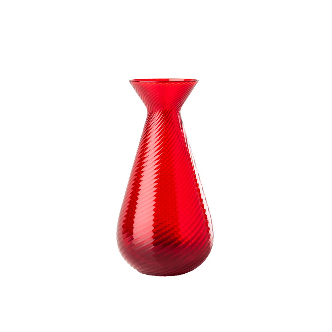 Raffinato vaso in vetro lavorato con tecnica Rigadin, caratterizzato da eleganti rigature che esaltano la luce e la profondità del colore. La tonalità rosso vivo dona energia e personalità, rendendolo un elemento distintivo per ogni ambiente.